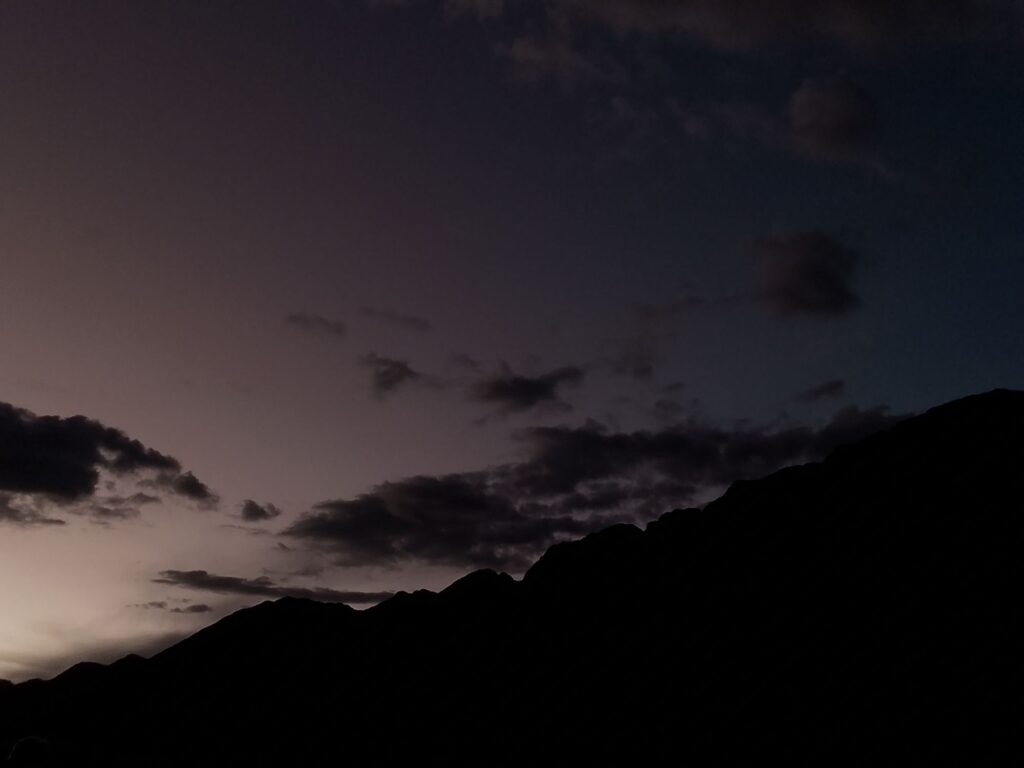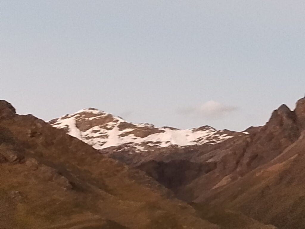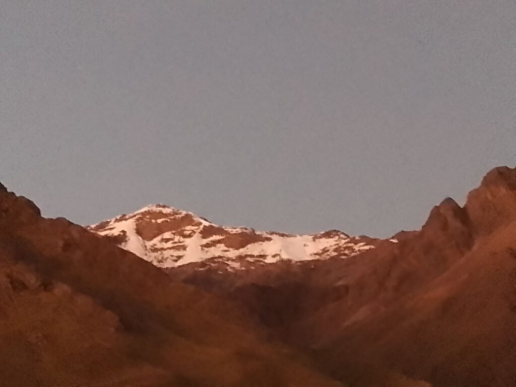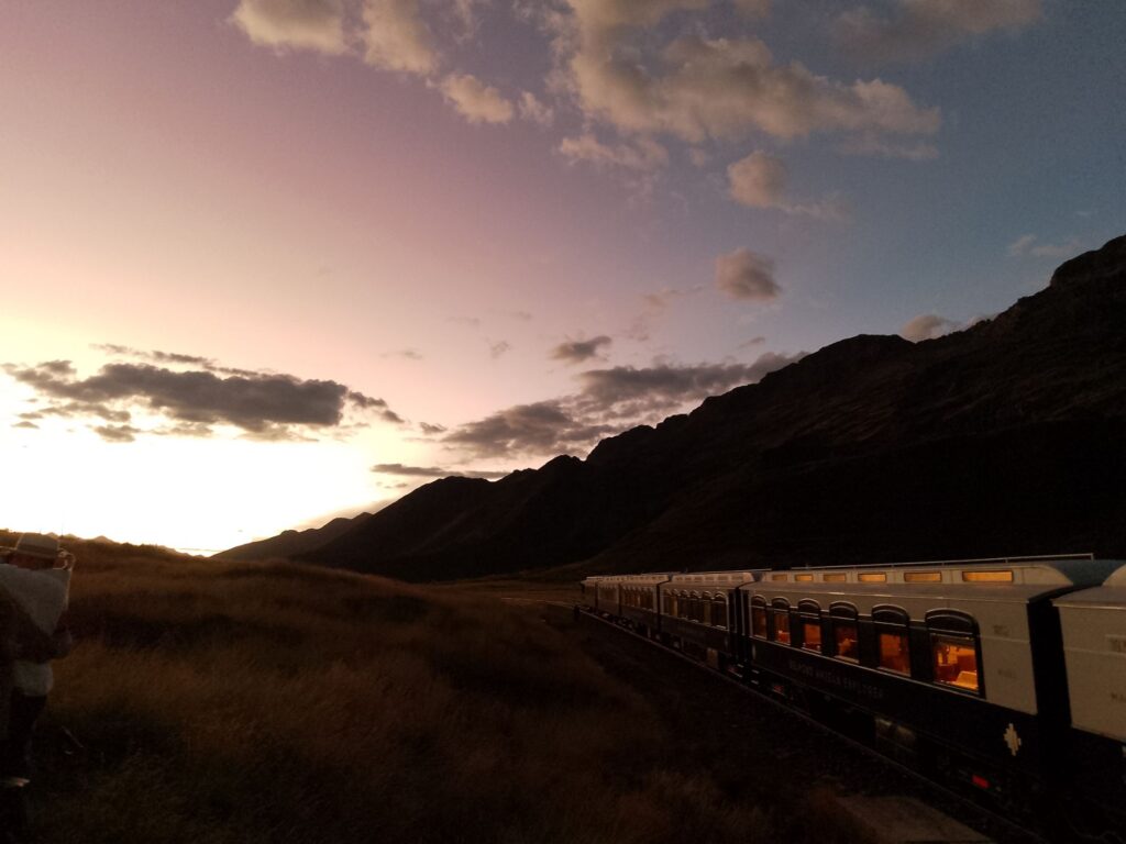The train stopped again for us to take some photos of the glacier topped mountains and the sun going down