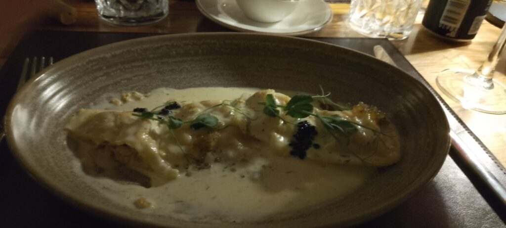 Had a very tasty bowl of salmon ravioli with a citrus sauce in the company of Jess and Trevor.