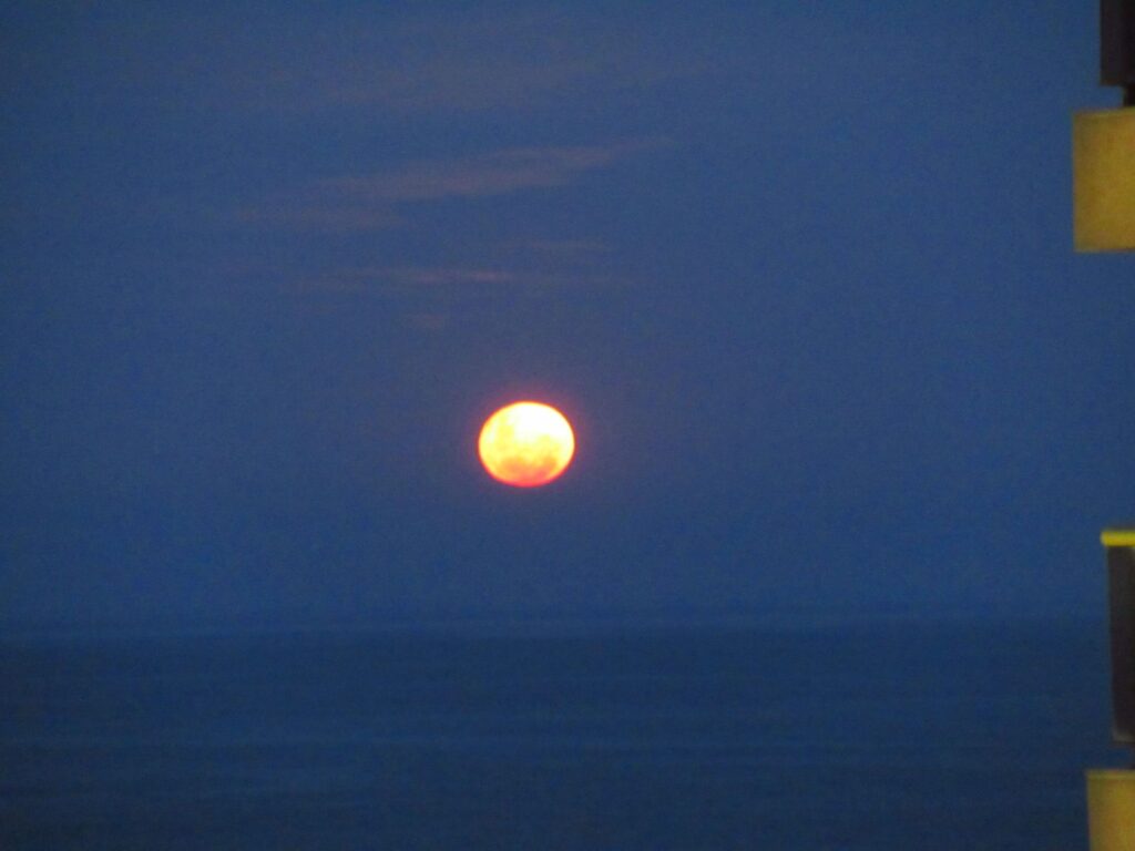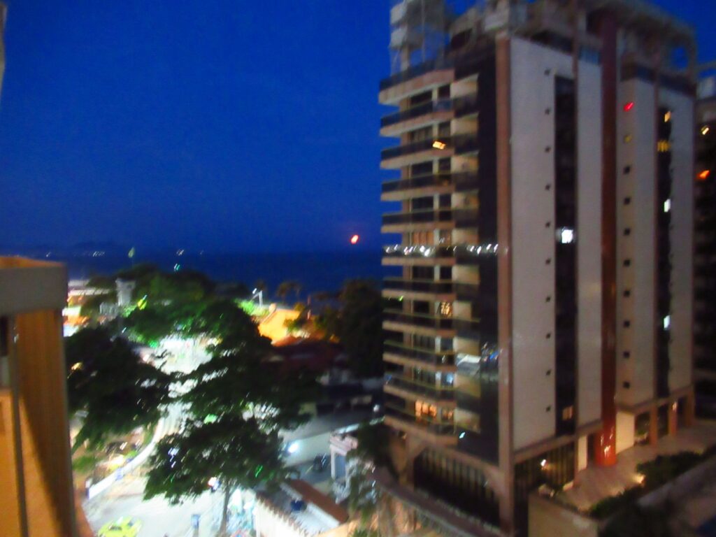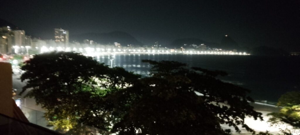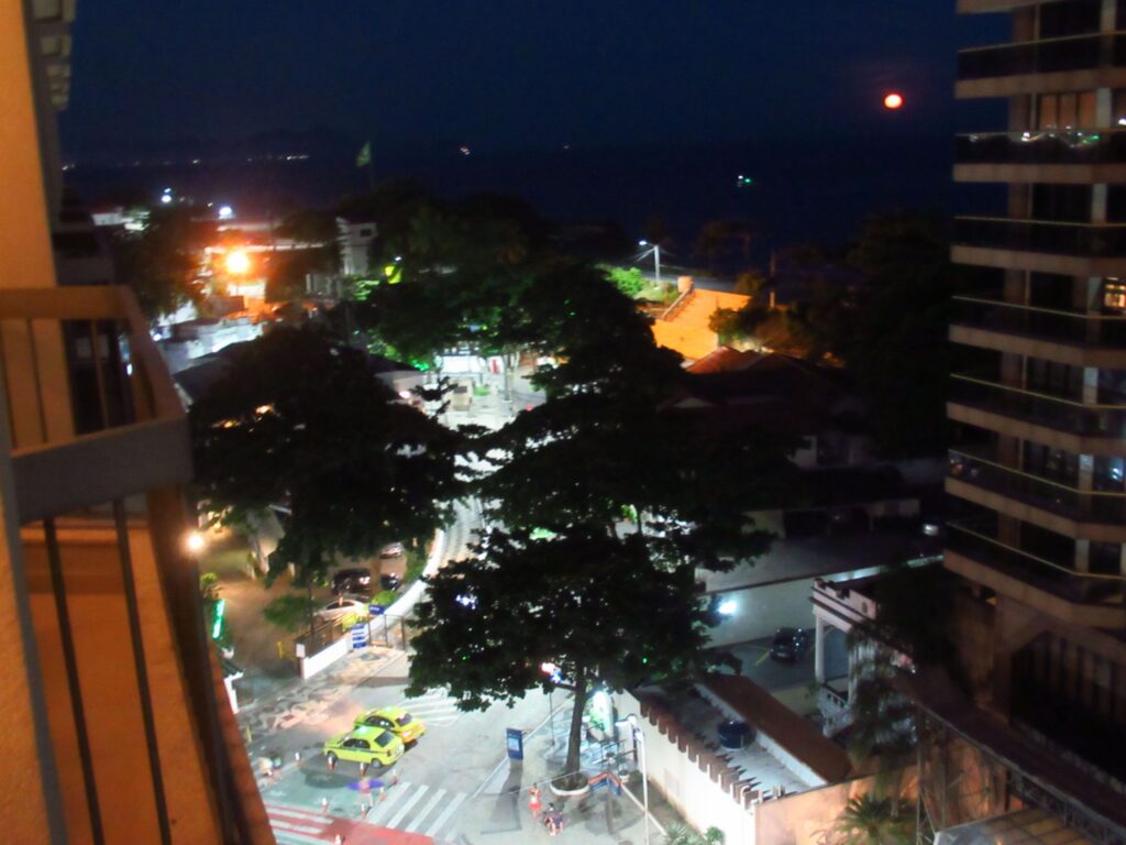 Arrived in Rio just as the sun was setting and the moon was coming up over the sea and the beach.