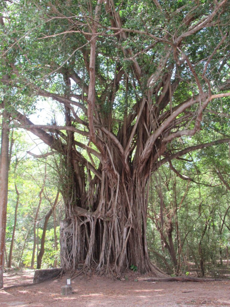 A large rubber plant with its roots growing from the branches, once they reach the ground they take root and form another branch.