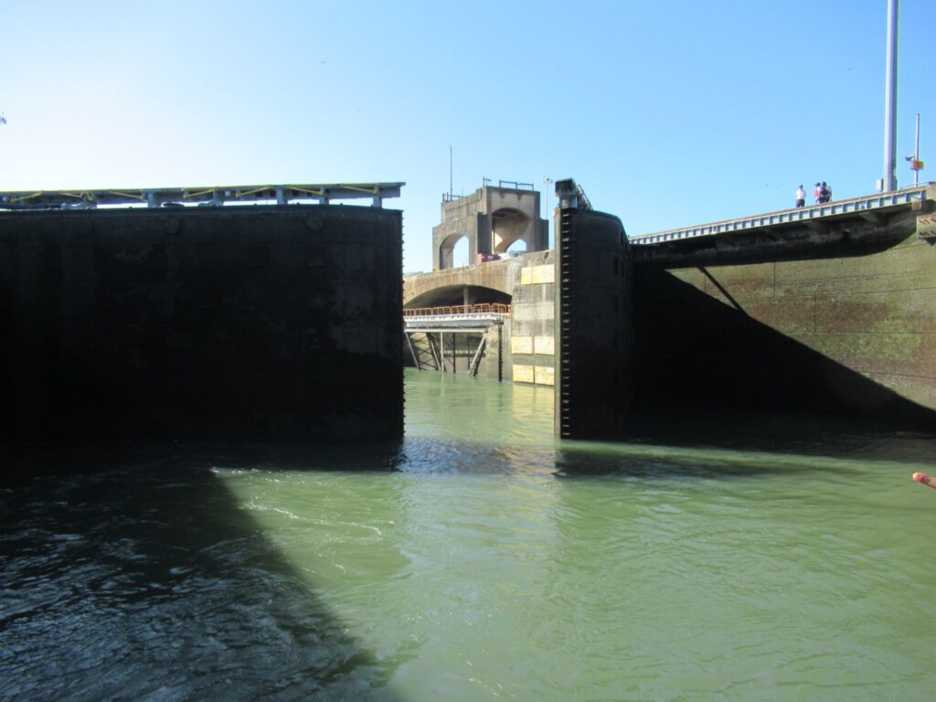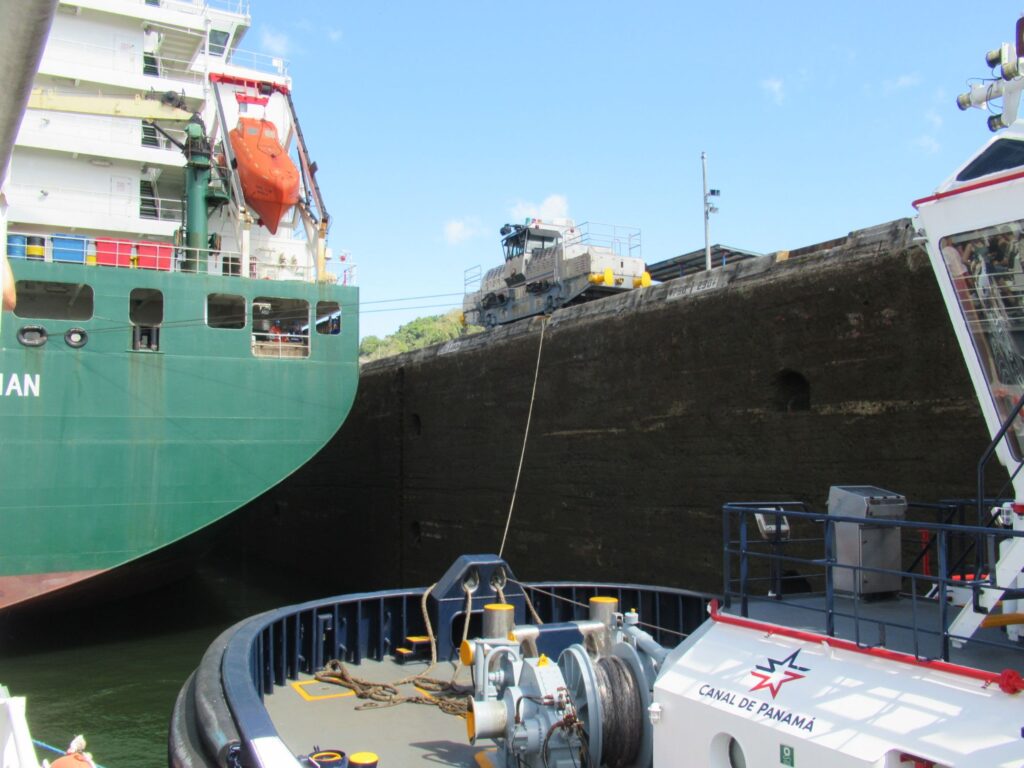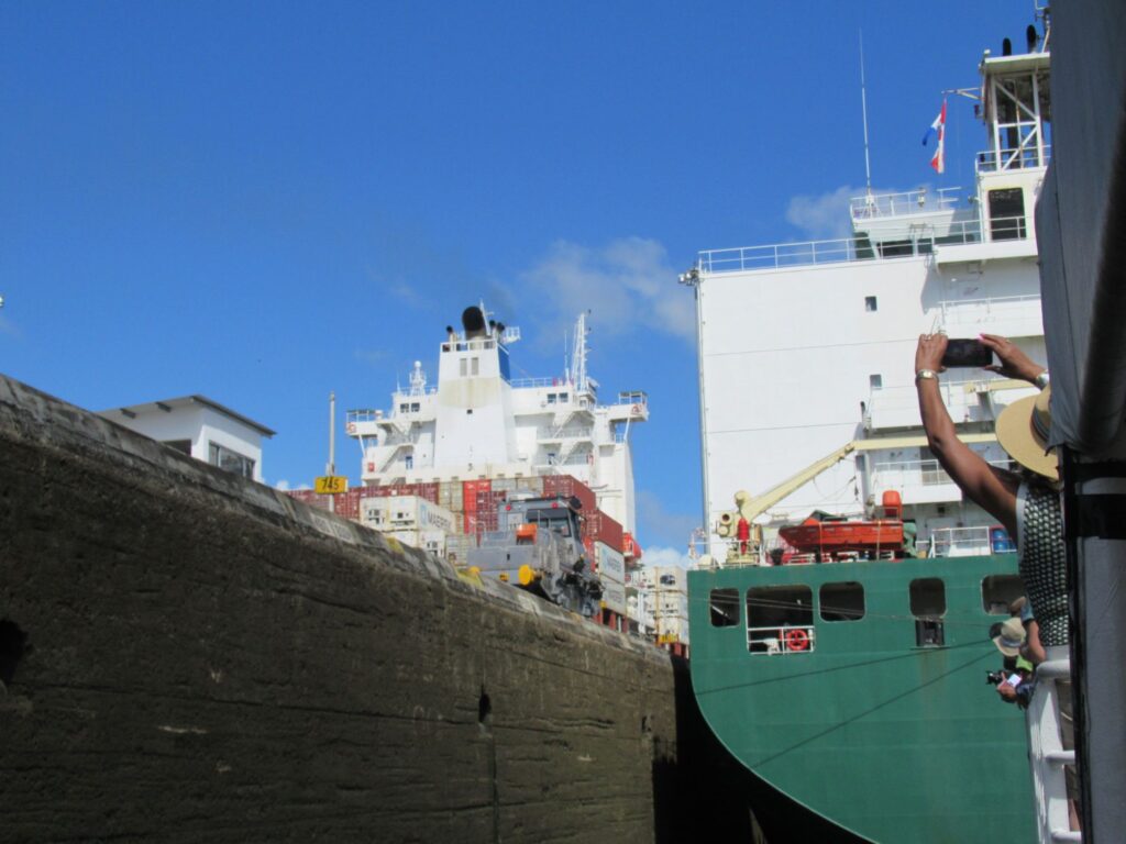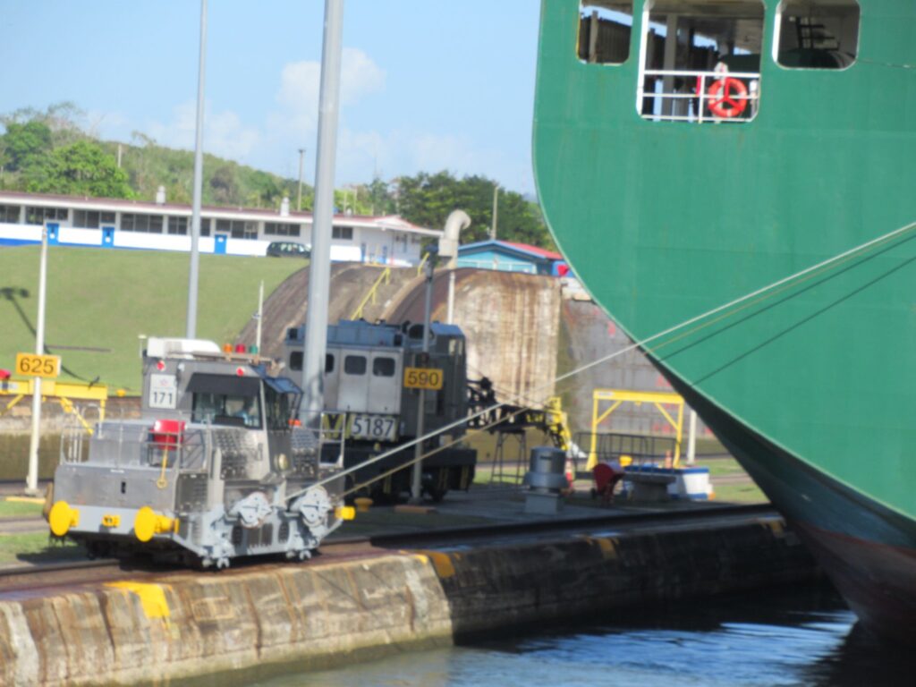 Tug boats and “mules” (small vehicles running on rails alongside) assist the larger boats attaching cables to pull them along. The boat in front of us needed the help of six mules.