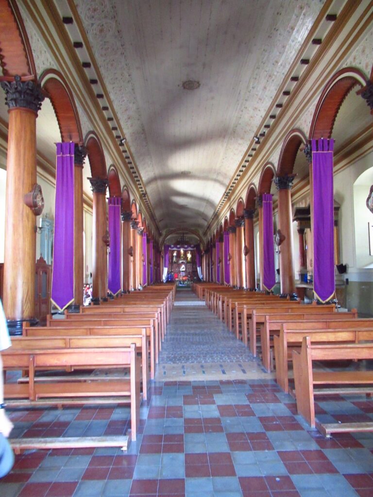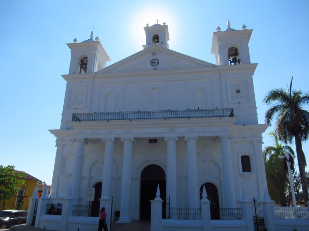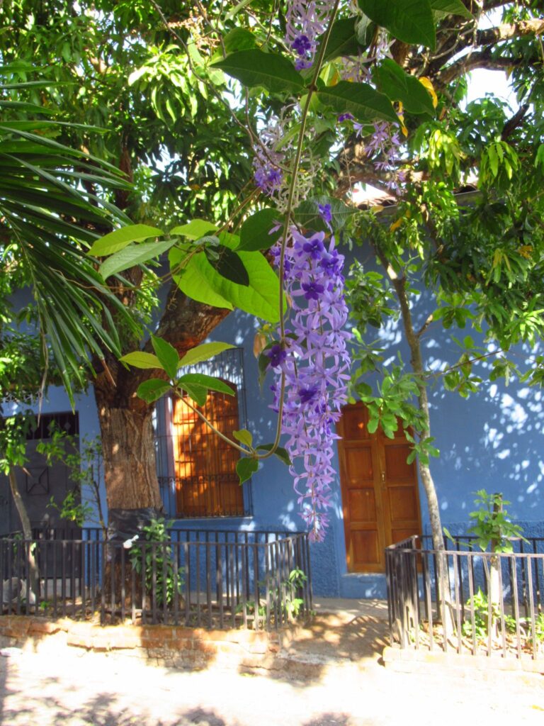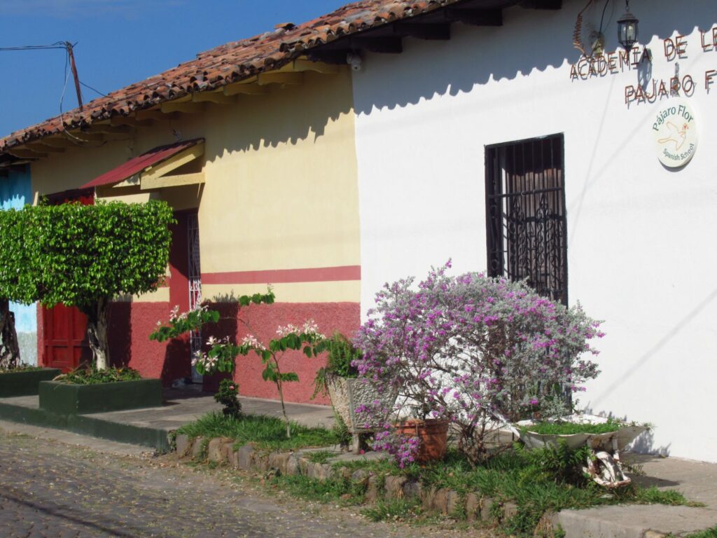 A short guided tour of Suchitoto, walking along the cobbled streets, Santa Lucia church, colourful houses and flowers.