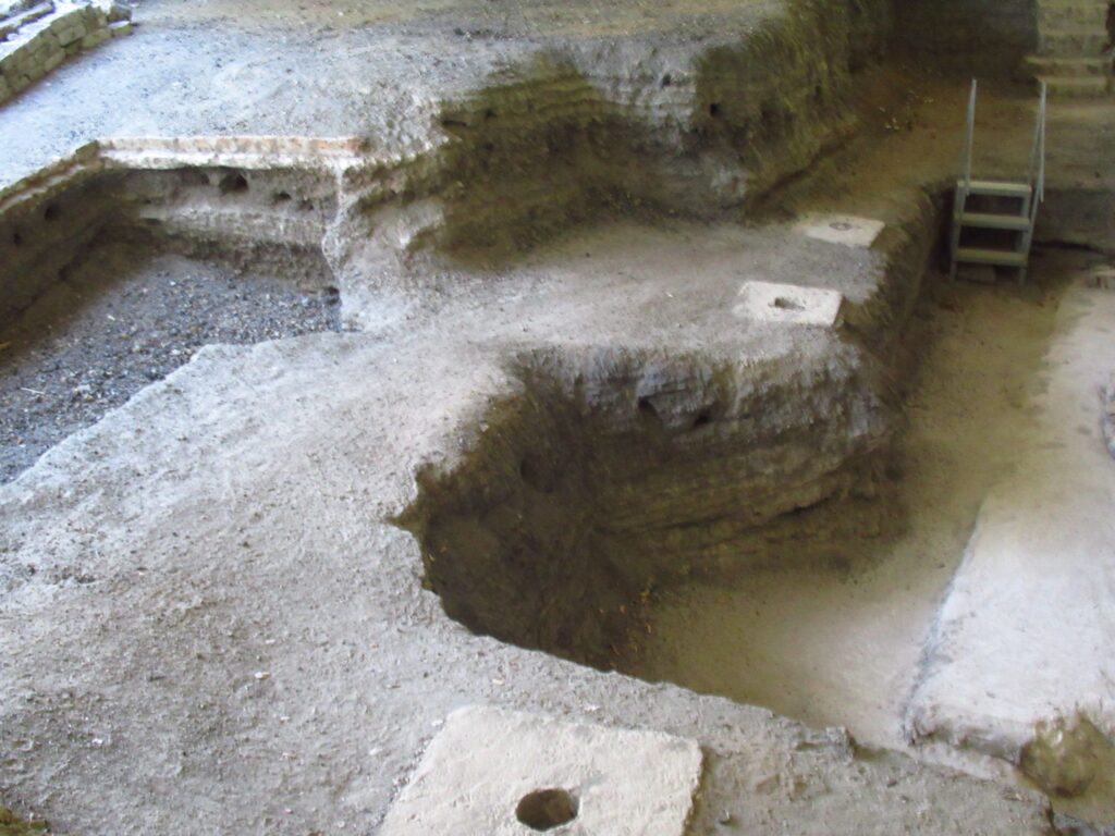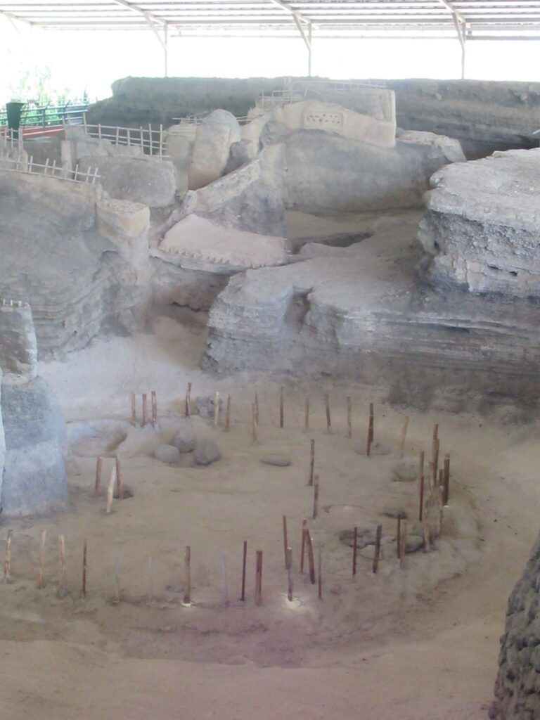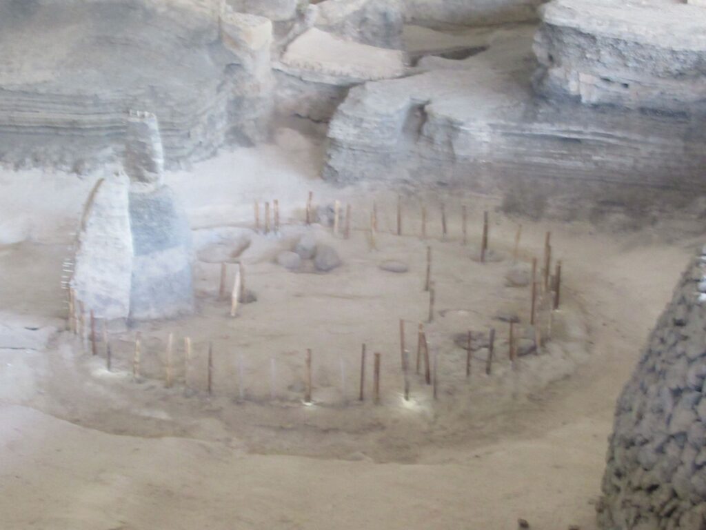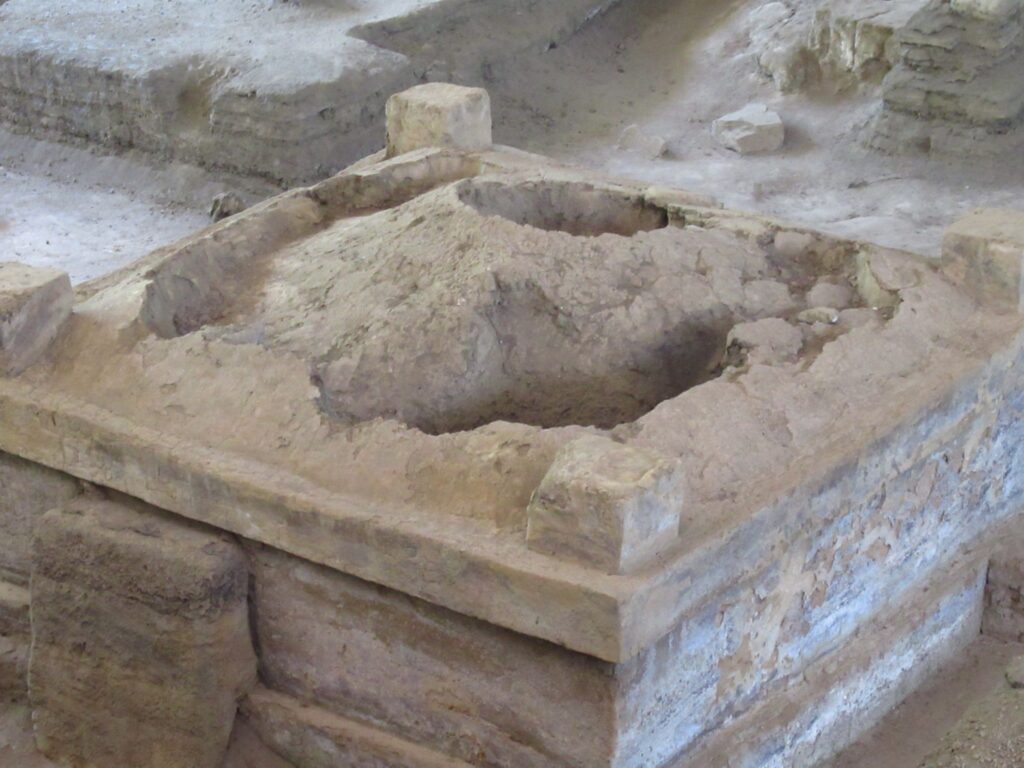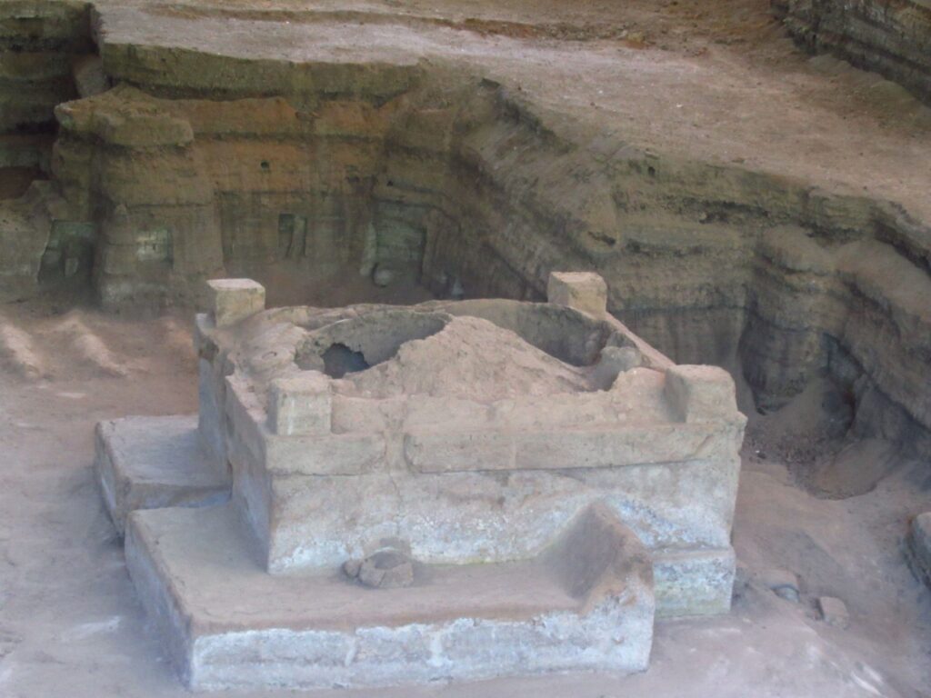 No human skeletons were found only the bones of a duck and a mouse. Not many artefacts were found with the exception of some remarkable pottery