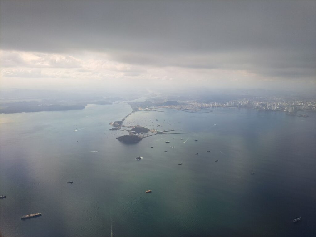 Flying into Panama, boats lined up to transit the canal